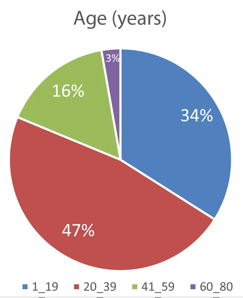Based on the age distribution, the sample predominantly consisted of young to middle-aged adults, with nearly half (47.3%) falling within the 20-39 years age group, followed by those in the 1-19 years age group (34.0%). Middle-aged participants aged 40-59 years represented 16.0% of the sample, and elderly participants aged 60-80 years constituted the smallest group at 2.8% (Figure 2).