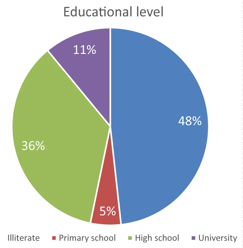 The participant’s gender was demonstrated in Figure 3, which showed that 62.0 % of subjects were male and 38.0% were female. The population had their marital status as demonstrated in Figure 4, which showed that 46% of the participants were married, and 54% of the participants were single. The Education level of the study population is presented in Figure 5. Most of the participants are Illiterate (48.0%), followed by High school graduates (36.0%), followed by Primary school (5%), and University graduates (11%).